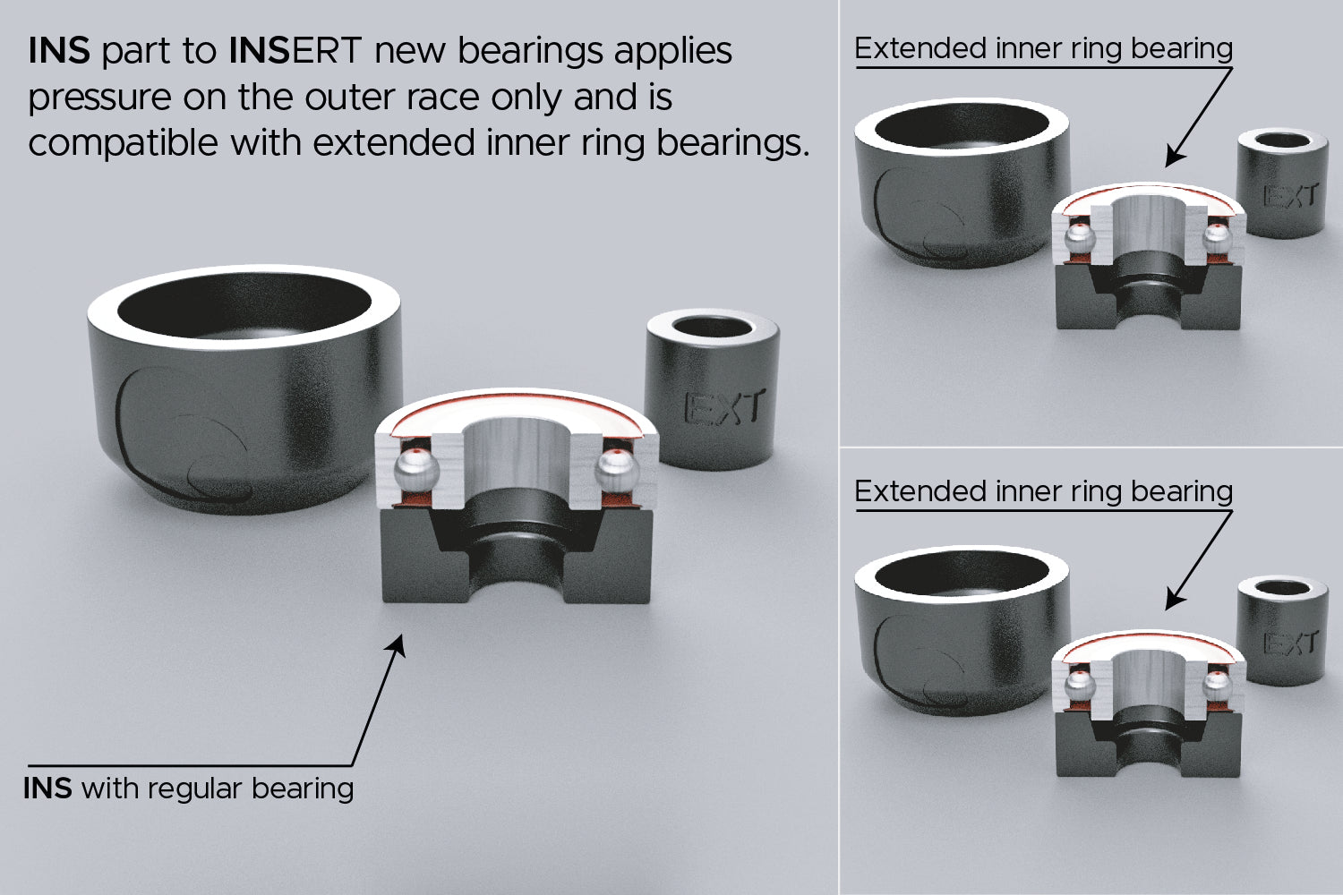 Composants clairement identifiés : Chaque pièce comporte un identifiant de roulement et des inscriptions fonctionnelles – INSérer & EXTraire – pour éliminer toute confusion lors de l’utilisation.